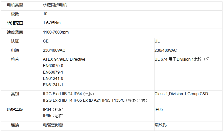 EX系列是設計適用于易燃氣體環(huán)境的一系列永磁同步伺服電機,可用于II 2GD Ex d IIB T4 IP65 Ex tD A21 IP65 T135°C(氣體和塵埃)的工況。